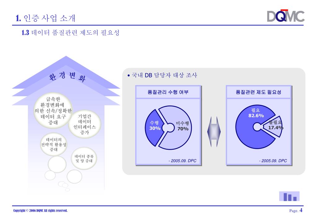 1. 인증 사업 소개 1.3 데이터 품질관련 제도의 필요성 • 국내 DB 담당자 대상 조사 경 변 환 화 품질관리 수행 여부 품질관련 제도 필요성 급속한 환경변화에 의한 신속/정확한 데이터 요구 증대 - 2005.09. DPC - 2005.09. DPC 필요 82.6% 기업간 데이터 인터페이스 증가 불필요 17.4% 수행 30% 미수행 70% 데이터의 전략적 활용성 증대 데이터 종류 및 양 증대