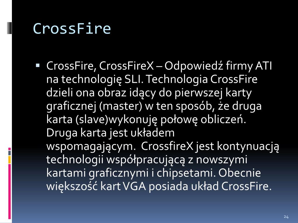 CrossFire • CrossFire, CrossFireX – Odpowiedź firmy ATI na technologię SLI. Technologia CrossFiredzieli ona obraz idący do pierwszej karty graficznej (master) w ten sposób, że druga karta (slave)wykonuję połowę obliczeń. Druga karta jest układem wspomagającym. CrossfireX jest kontynuacją technologii współpracującą z nowszymi kartami graficznymi i chipsetami. Obecnie większość kart VGA posiada układ CrossFire.