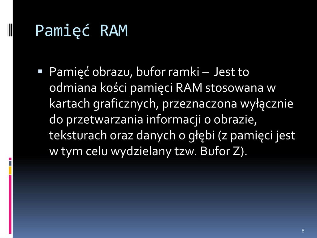 Pamięć RAM • Pamięć obrazu, bufor ramki – Jest to odmiana kości pamięci RAM stosowana w kartach graficznych, przeznaczona wyłącznie do przetwarzania informacji o obrazie, teksturach oraz danych o głębi (z pamięci jest w tym celu wydzielany tzw. Bufor Z).