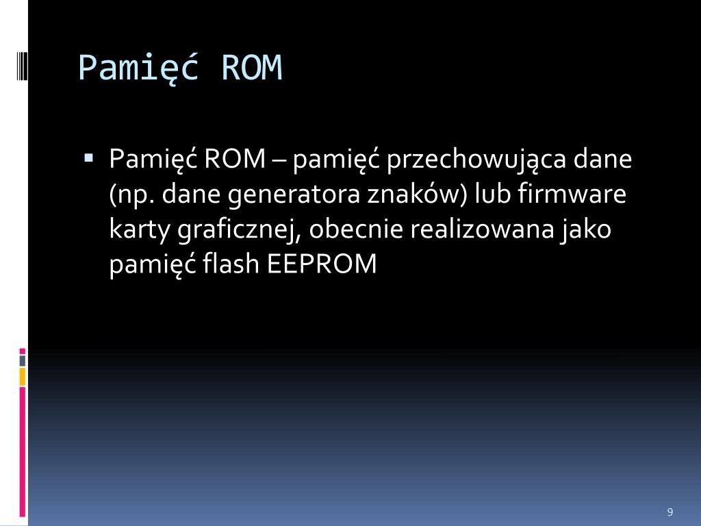 Pamięć ROM • Pamięć ROM – pamięć przechowująca dane (np. dane generatora znaków) lub firmware karty graficznej, obecnie realizowana jako pamięć flash EEPROM
