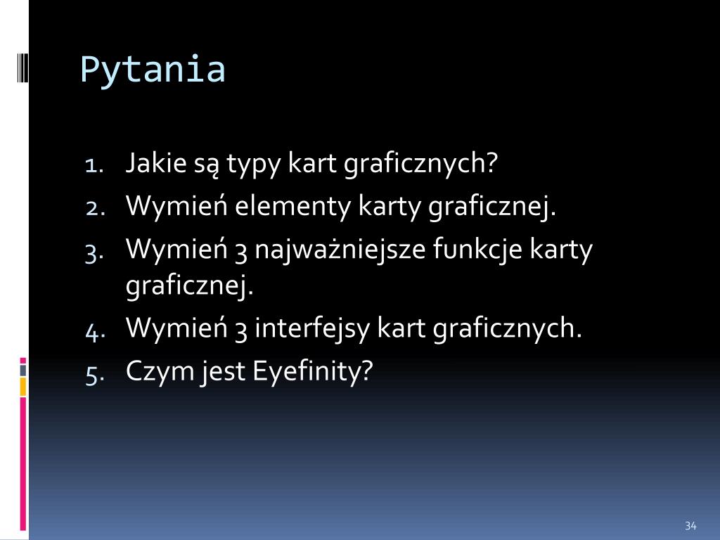 Pytania • Jakie są typy kart graficznych? • Wymień elementy karty graficznej. • Wymień 3 najważniejsze funkcje karty graficznej. • Wymień 3 interfejsy kart graficznych. • Czym jest Eyefinity?