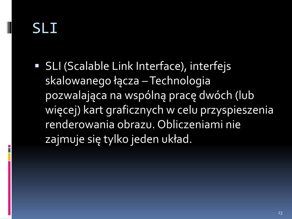 SLI • SLI (Scalable Link Interface), interfejs skalowanego łącza – Technologia pozwalająca na wspólną pracę dwóch (lub więcej) kart graficznych w celu przyspieszenia renderowania obrazu. Obliczeniami nie zajmuje się tylko jeden układ.
