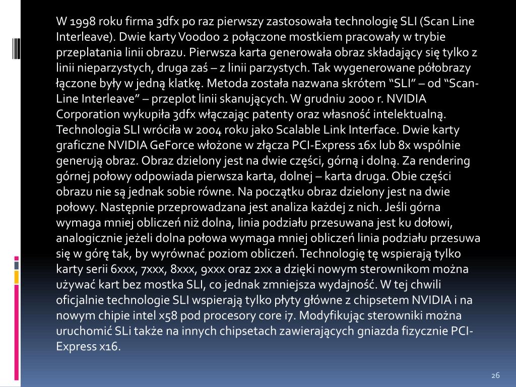W 1998 roku firma 3dfx po raz pierwszy zastosowała technologię SLI (Scan Line Interleave). Dwie karty Voodoo 2 połączone mostkiem pracowały w trybie przeplatania linii obrazu. Pierwsza karta generowała obraz składający się tylko z linii nieparzystych, druga zaś – z linii parzystych. Tak wygenerowane półobrazy łączone były w jedną klatkę. Metoda została nazwana skrótem “SLI” – od “Scan-Line Interleave” – przeplot linii skanujących. W grudniu 2000 r. NVIDIA Corporation wykupiła 3dfx włączając patenty oraz własność intelektualną. Technologia SLI wróciła w 2004 roku jako Scalable Link Interface. Dwie karty graficzne NVIDIA GeForce włożone w złącza PCI-Express 16x lub 8x wspólnie generują obraz. Obraz dzielony jest na dwie części, górną i dolną. Za rendering górnej połowy odpowiada pierwsza karta, dolnej – karta druga. Obie części obrazu nie są jednak sobie równe. Na początku obraz dzielony jest na dwie połowy. Następnie przeprowadzana jest analiza każdej z nich. Jeśli górna wymaga mniej obliczeń niż dolna, linia podziału przesuwana jest ku dołowi, analogicznie jeżeli dolna połowa wymaga mniej obliczeń linia podziału przesuwa się w górę tak, by wyrównać poziom obliczeń. Technologię tę wspierają tylko karty serii 6xxx, 7xxx, 8xxx, 9xxx oraz 2xx a dzięki nowym sterownikom można używać kart bez mostka SLI, co jednak zmniejsza wydajność. W tej chwili oficjalnie technologie SLI wspierają tylko płyty główne z chipsetem NVIDIA i na nowym chipie intel x58 pod procesory core i7. Modyfikując sterowniki można uruchomić SLi także na innych chipsetach zawierających gniazda fizycznie PCI-Express x16.