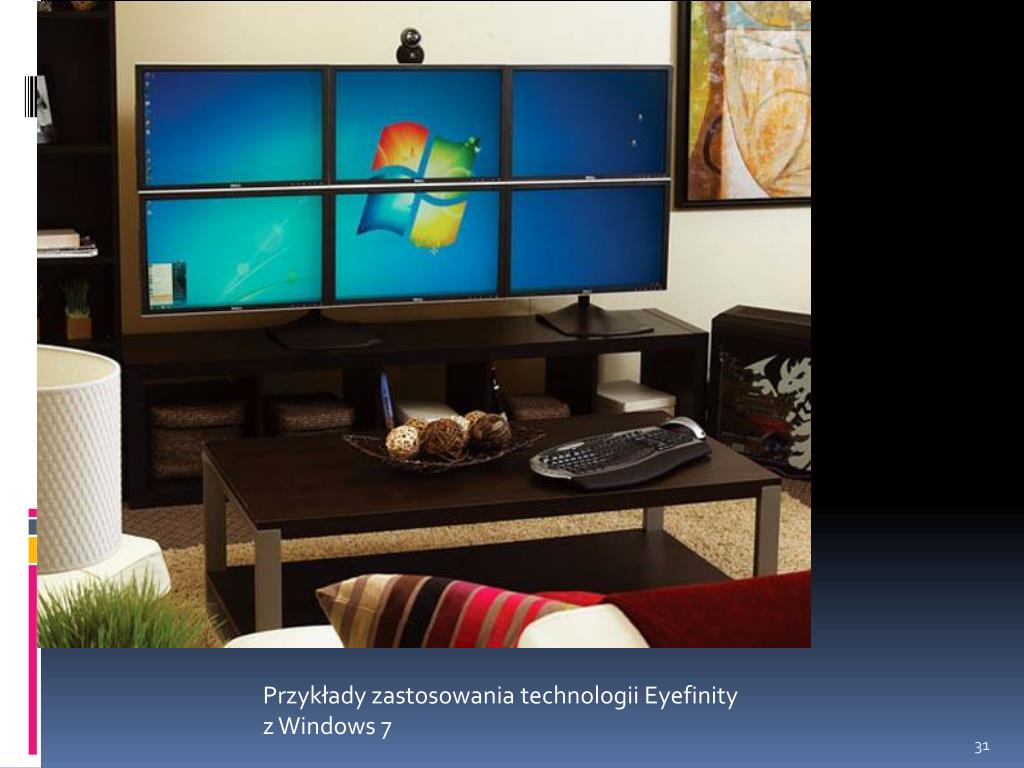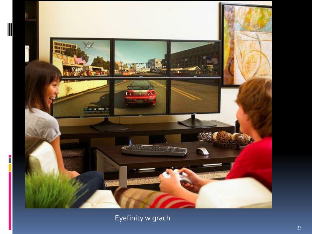 Czym jestEyefinity? • Eyefinity – Technologia opracowana przez ATI pozwalająca jednej karcie graficznej obsługiwać wiele monitorów (standardowo 3 a w przypadku Eyefinity6, jak sama nazwa wskazuje jest to 6 monitorów). Na potrzeby Eyefinity6 została stworzona specjalna karta Radeon HD5870 posiadająca sześć złączy mini-DisplayPort. Technologia Eyefinity pozwala na dowolne ułożenie monitorów co przedstawia obrazek poniżej: