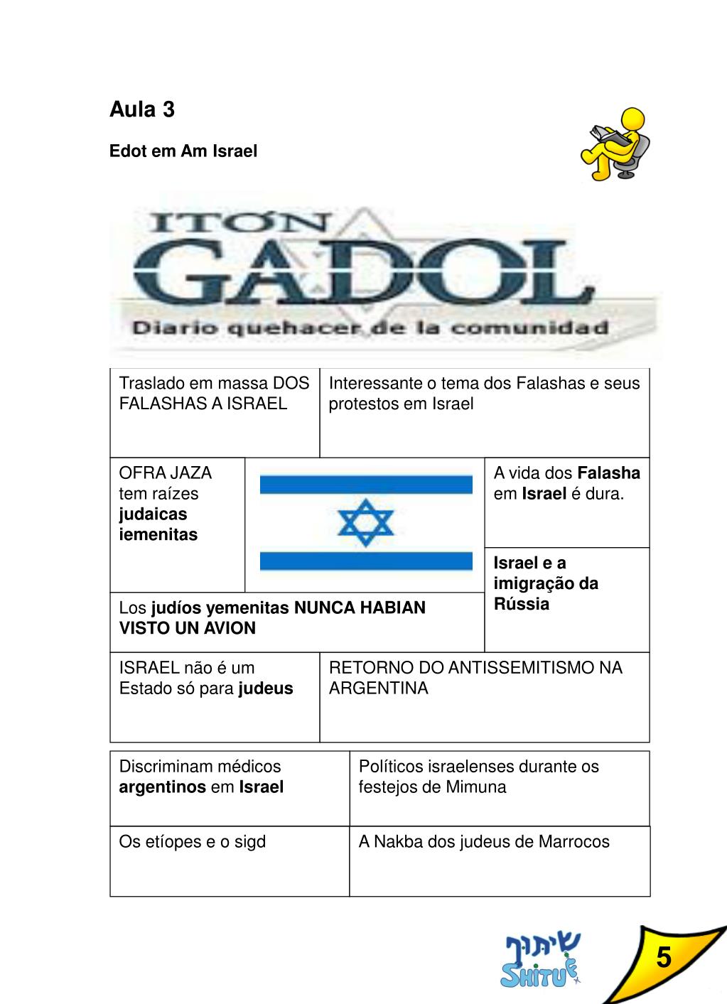 Aula7 • A diversidade étnica em Medinat Israel • A dança como costume característico dos judeus iemenitas • Música tradicional iemenita: www.youtube.com/watch?v=Ua9ybbqeTFy • Aula 8 • A diversidade étnica em Medinat Israel • O jogo entre a heterogeneidade e a homogeneidade nos grupos étnicos de Medinat Israel • Vídeo Ani Ieudi: www.youtube.com/watch?v=bu4tDjoHZ1E • Por que escolhemos este vídeo? • Qual é a relação entre esta canção e o programa de televisão? • Qual é a mensagem transmitida por esta canção? • Qual é a relação desta canção com as edot? • O que significa o título desta canção? 9
