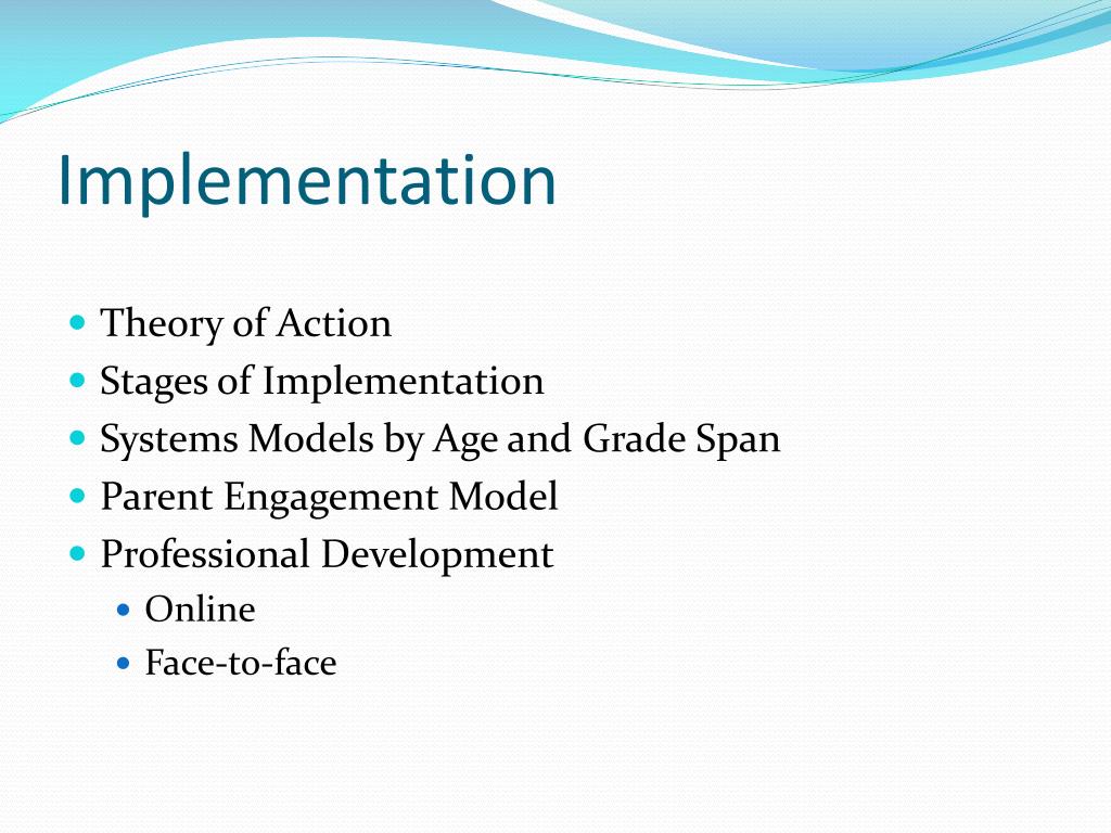 Implementation • Theory of Action • Stages of Implementation • Systems Models by Age and Grade Span • Parent Engagement Model • Professional Development • Online • Face-to-face