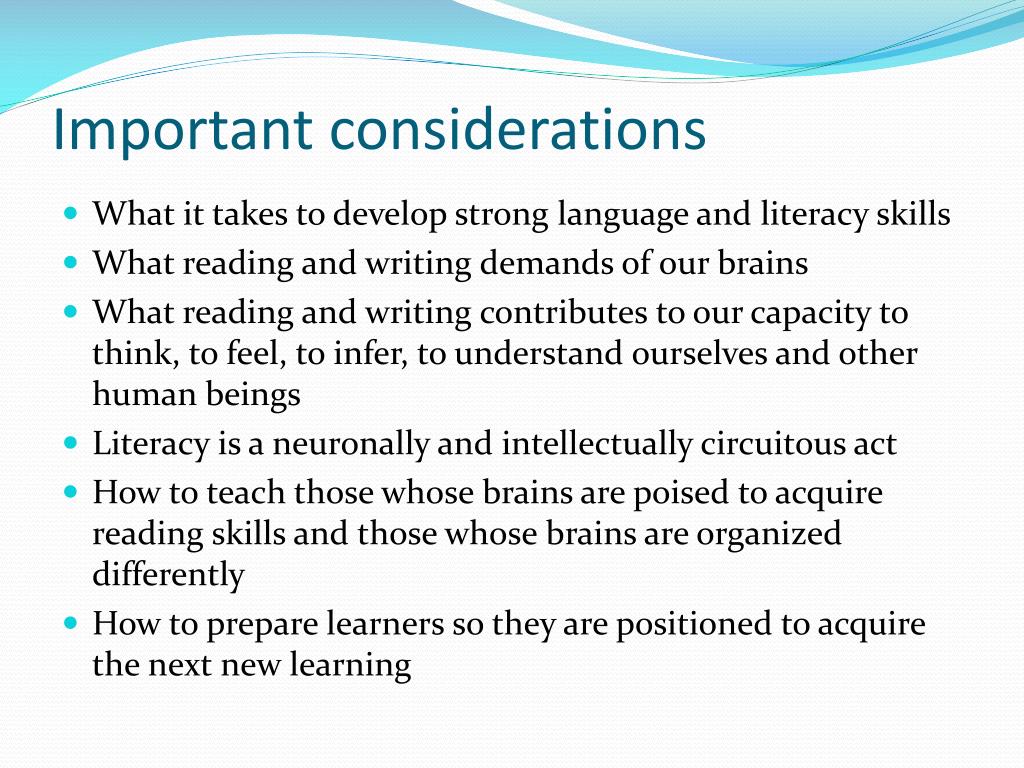 Important considerations • What it takes to develop strong language and literacy skills • What reading and writing demands of our brains • What reading and writing contributes to our capacity to think, to feel, to infer, to understand ourselves and other human beings • Literacy is a neuronally and intellectually circuitous act • How to teach those whose brains are poised to acquire reading skills and those whose brains are organized differently • How to prepare learners so they are positioned to acquire the next new learning