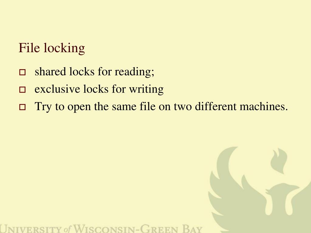 File locking • shared locks for reading; • exclusive locks for writing • Try to open the same file on two different machines.