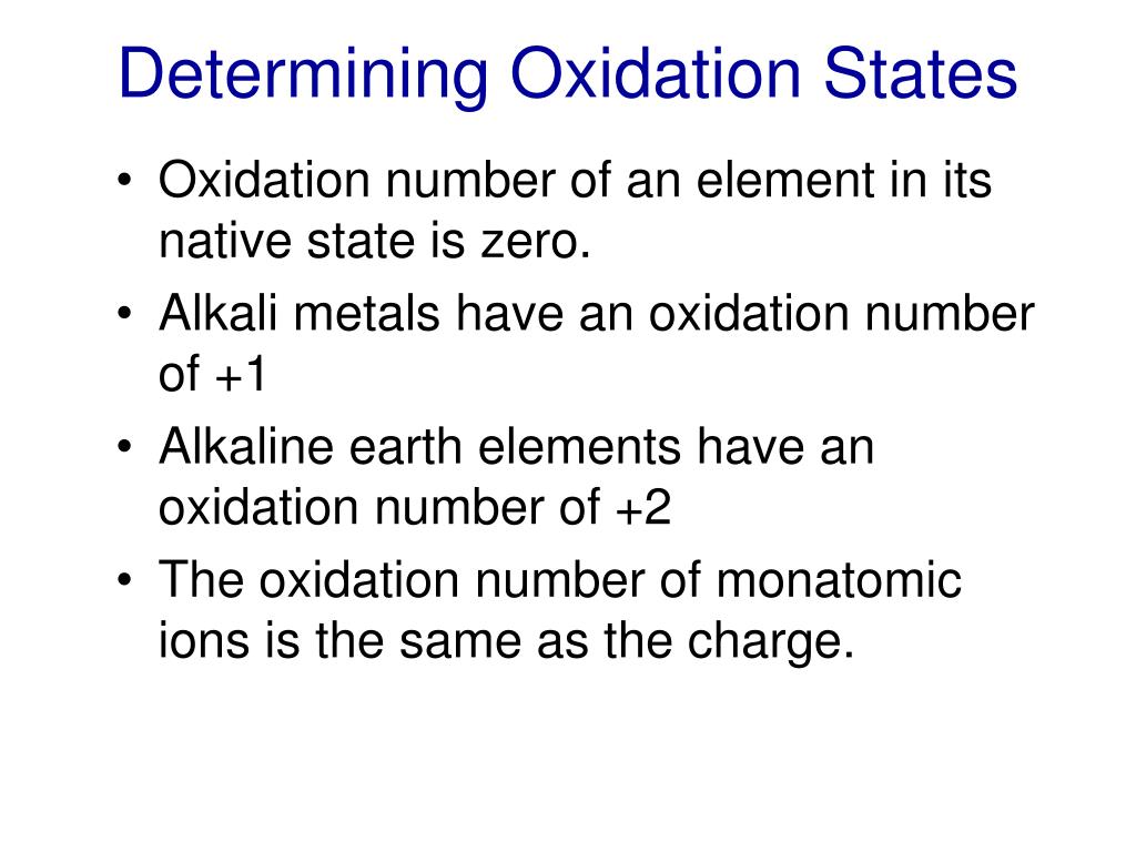 Determining Oxidation States • Oxidation number of an element in its native state is zero. • Alkali metals have an oxidation number of +1 • Alkaline earth elements have an oxidation number of +2 • The oxidation number of monatomic ions is the same as the charge.