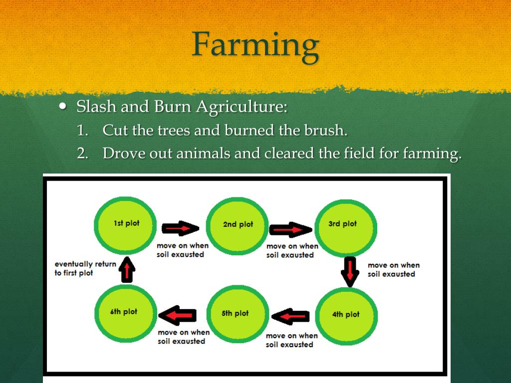 Farming • Slash and Burn Agriculture: • Cut the trees and burned the brush. • Drove out animals and cleared the field for farming.
