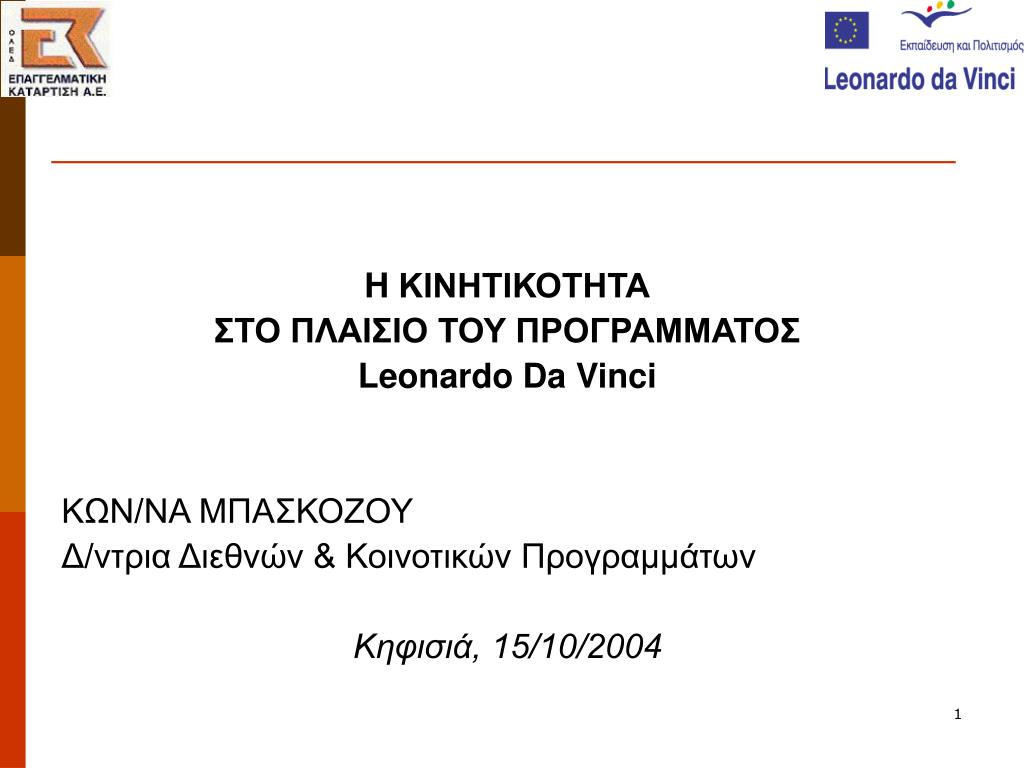 H ΚΙΝΗΤΙΚΟΤΗΤΑ ΣΤΟ ΠΛΑΙΣΙΟ ΤΟΥ ΠΡΟΓΡΑΜΜΑΤΟΣ Leonardo Da Vinci ΚΩΝ/ΝΑ ΜΠΑΣΚΟΖΟΥ Δ/ντρια Διεθνών & Κοινοτικών Προγραμμάτων Κηφισιά, 15/10/2004