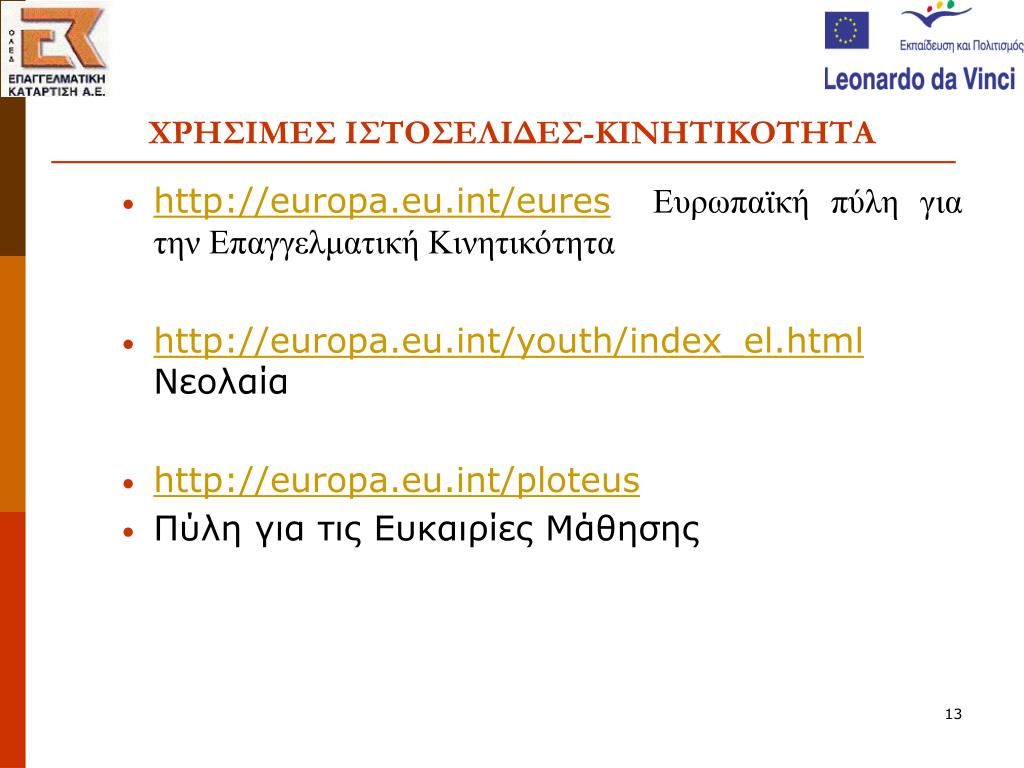 ΧΡΗΣΙΜΕΣ ΙΣΤΟΣΕΛΙΔΕΣ-ΚΙΝΗΤΙΚΟΤΗΤΑ • http://europa.eu.int/euresΕυρωπαϊκή πύλη για την Επαγγελματική Κινητικότητα • http://europa.eu.int/youth/index_el.html Νεολαία • http://europa.eu.int/ploteus • Πύλη για τις Ευκαιρίες Μάθησης
