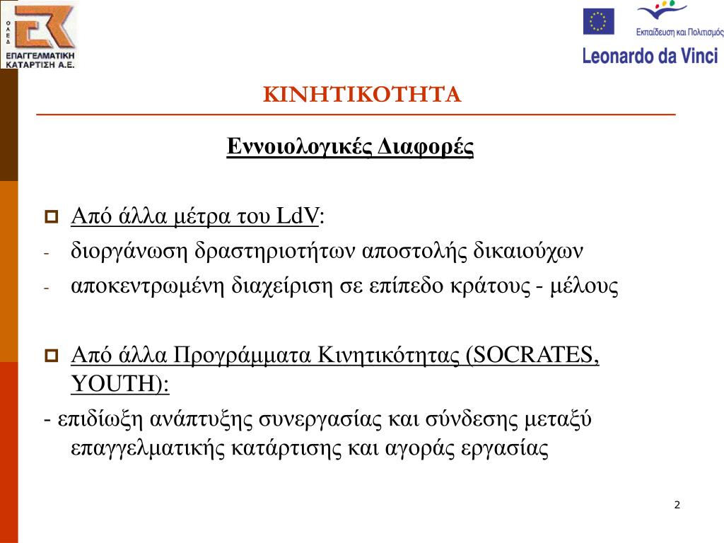 ΚΙΝΗΤΙΚΟΤΗΤΑ Εννοιολογικές Διαφορές • Από άλλα μέτρα του LdV: • διοργάνωση δραστηριοτήτων αποστολής δικαιούχων • αποκεντρωμένη διαχείριση σε επίπεδο κράτους - μέλους • Από άλλα Προγράμματα Κινητικότητας (SOCRATES, YOUTH): - επιδίωξη ανάπτυξης συνεργασίας και σύνδεσης μεταξύ επαγγελματικής κατάρτισης και αγοράς εργασίας