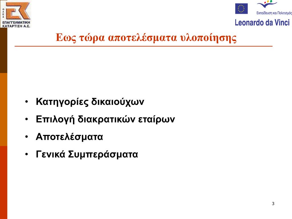 Εως τώρα αποτελέσματα υλοποίησης • Κατηγορίες δικαιούχων • Επιλογή διακρατικών εταίρων • Αποτελέσματα • Γενικά Συμπεράσματα