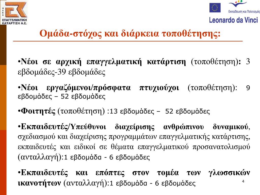 Ομάδα-στόχος και διάρκεια τοποθέτησης: • Νέοι σε αρχική επαγγελματική κατάρτιση (τοποθέτηση): 3 εβδομάδες-39 εβδομάδες • Νέοι εργαζόμενοι/πρόσφατα πτυχιούχοι (τοποθέτηση): 9 εβδομάδες – 52 εβδομάδες • Φοιτητές (τοποθέτηση) :13 εβδομάδες – 52 εβδομάδες • Εκπαιδευτές/Υπεύθυνοι διαχείρισης ανθρώπινου δυναμικού, σχεδιασμού και διαχείρισης προγραμμάτων επαγγελματικής κατάρτισης, εκπαιδευτές και ειδικοί σε θέματα επαγγελματικού προσανατολισμού (ανταλλαγή):1 εβδομάδα - 6 εβδομάδες • Εκπαιδευτές και επόπτες στον τομέα των γλωσσικών ικανοτήτων (ανταλλαγή):1 εβδομάδα - 6 εβδομάδες