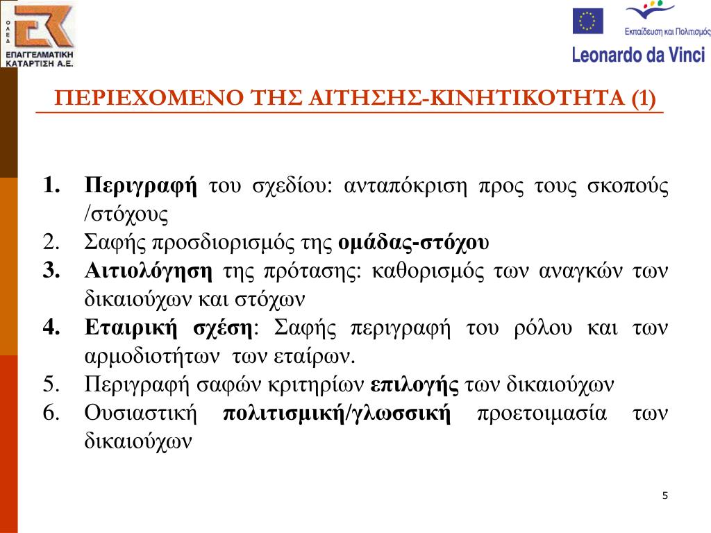ΠΕΡΙΕΧΟΜΕΝΟ ΤΗΣ ΑΙΤΗΣΗΣ-ΚΙΝΗΤΙΚΟΤΗΤΑ (1) • Περιγραφή του σχεδίου: ανταπόκριση προς τους σκοπούς /στόχους • Σαφής προσδιορισμός της ομάδας-στόχου • Αιτιολόγηση της πρότασης: καθορισμός των αναγκών των δικαιούχων και στόχων • Εταιρική σχέση: Σαφής περιγραφή του ρόλου και των αρμοδιοτήτων των εταίρων. • Περιγραφή σαφών κριτηρίων επιλογής των δικαιούχων • Ουσιαστική πολιτισμική/γλωσσική προετοιμασία των δικαιούχων