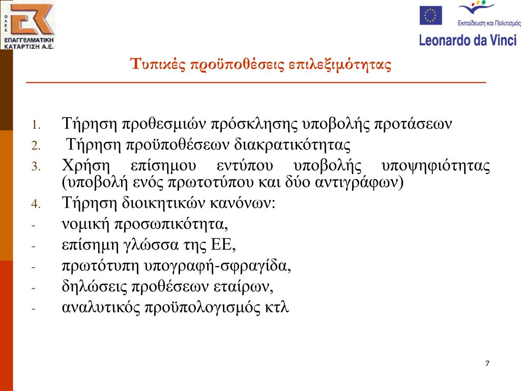 Τυπικές προϋποθέσεις επιλεξιμότητας • Τήρηση προθεσμιών πρόσκλησης υποβολής προτάσεων • Τήρηση προϋποθέσεων διακρατικότητας • Χρήση επίσημου εντύπου υποβολής υποψηφιότητας (υποβολή ενός πρωτοτύπου και δύο αντιγράφων) • Τήρηση διοικητικών κανόνων: • νομική προσωπικότητα, • επίσημη γλώσσα της ΕΕ, • πρωτότυπη υπογραφή-σφραγίδα, • δηλώσεις προθέσεων εταίρων, • αναλυτικός προϋπολογισμός κτλ