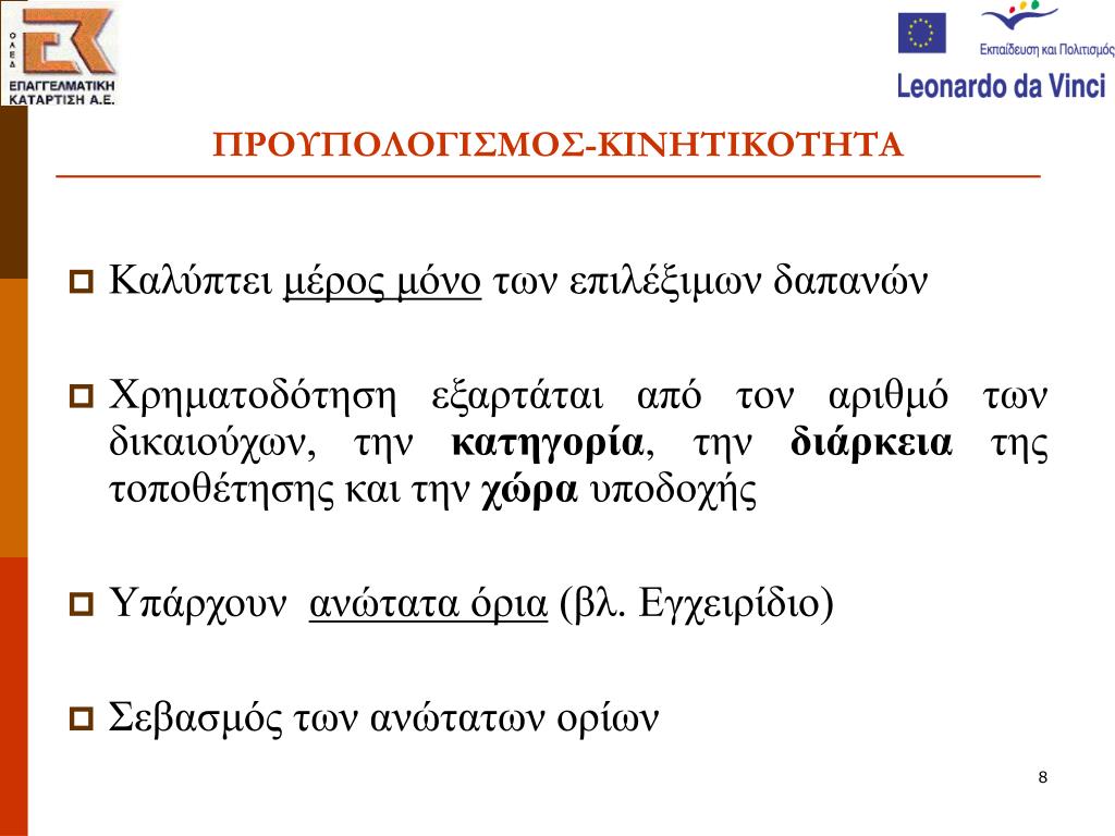 ΠΡΟΥΠΟΛΟΓΙΣΜΟΣ-ΚΙΝΗΤΙΚΟΤΗΤΑ • Καλύπτει μέρος μόνο των επιλέξιμων δαπανών • Χρηματοδότηση εξαρτάται από τον αριθμό των δικαιούχων, την κατηγορία, την διάρκεια της τοποθέτησης και την χώρα υποδοχής • Υπάρχουν ανώτατα όρια (βλ. Εγχειρίδιο) • Σεβασμός των ανώτατων ορίων