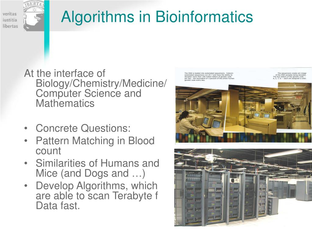 Algorithms in Bioinformatics At the interface of Biology/Chemistry/Medicine/ Computer Science and Mathematics • Concrete Questions: • Pattern Matching in Blood count • Similarities of Humans and Mice (and Dogs and …) • Develop Algorithms, which are able to scan Terabyte f Data fast.
