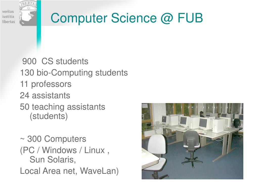 Computer Science @ FUB 900 CS students 130 bio-Computing students 11 professors 24 assistants 50 teaching assistants(students) ~ 300 Computers (PC / Windows / Linux , Sun Solaris, Local Area net, WaveLan)