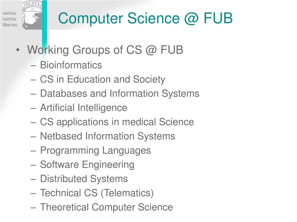 Computer Science @ FUB • Working Groups of CS @ FUB • Bioinformatics • CS in Education and Society • Databases and Information Systems • Artificial Intelligence • CS applications in medical Science • Netbased Information Systems • Programming Languages • Software Engineering • Distributed Systems • Technical CS (Telematics) • Theoretical Computer Science