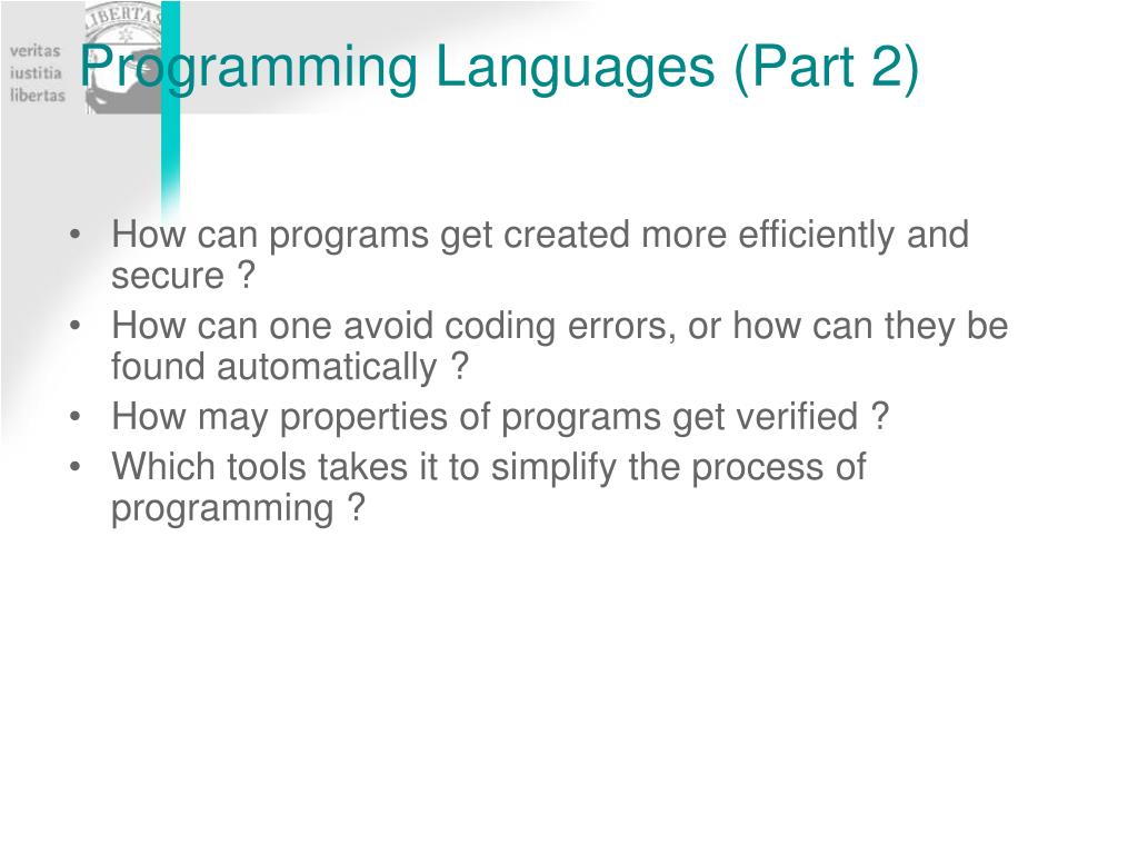 Programming Languages (Part 2) • How can programs get created more efficiently and secure ? • How can one avoid coding errors, or how can they be found automatically ? • How may properties of programs get verified ? • Which tools takes it to simplify the process of programming ?