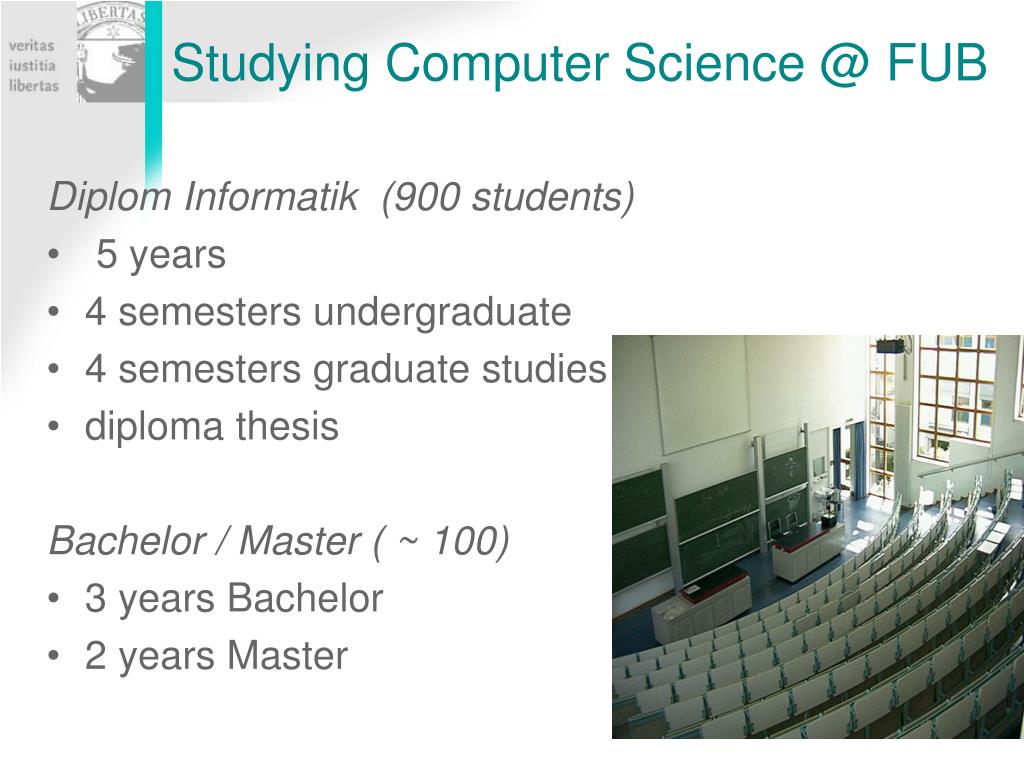 Studying Computer Science @ FUB Diplom Informatik (900 students) • 5 years • 4 semesters undergraduate • 4 semesters graduate studies • diploma thesis Bachelor / Master ( ~ 100) • 3 years Bachelor • 2 years Master