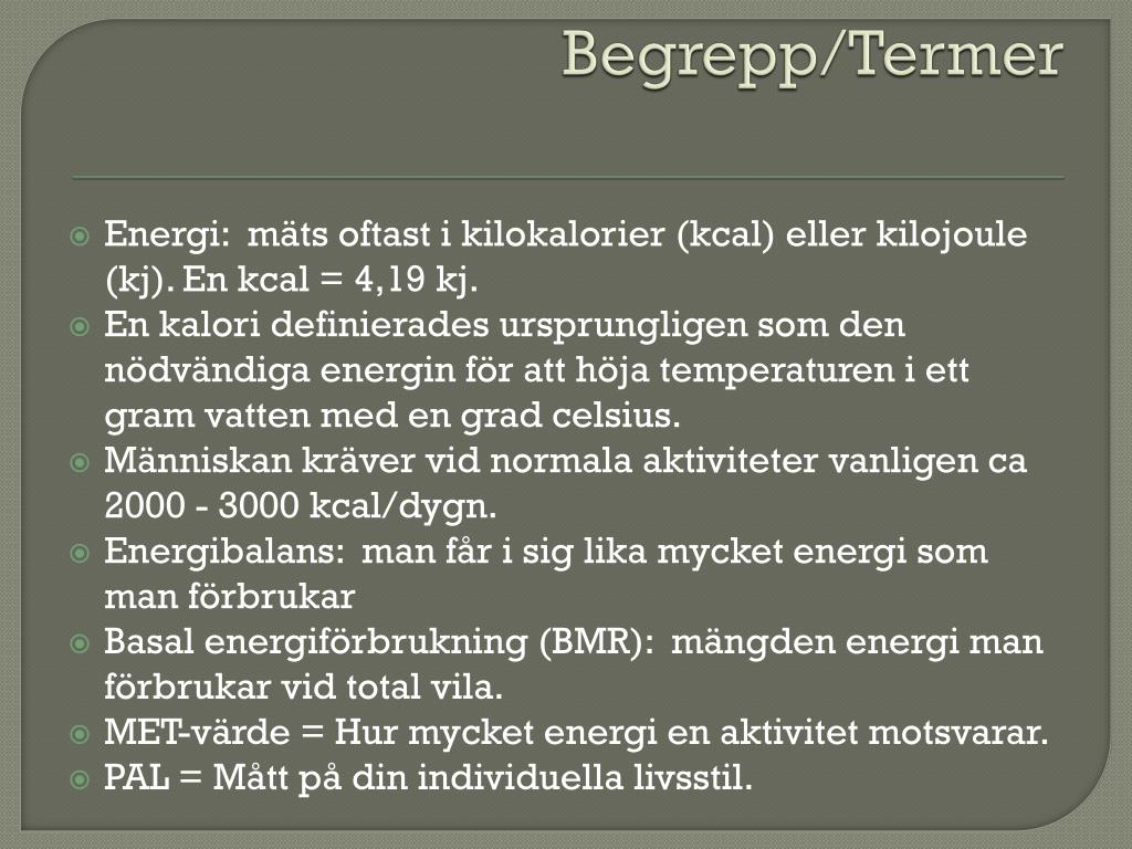 Begrepp/Termer Energi: mäts oftast i kilokalorier (kcal) eller kilojoule (kj). En kcal = 4,19 kj. En kalori definierades ursprungligen som den nödvändiga energin för att höja temperaturen i ett gram vatten med en grad celsius. Människan kräver vid normala aktiviteter vanligen ca 2000 - 3000 kcal/dygn. Energibalans: man får i sig lika mycket energi som man förbrukar Basal energiförbrukning (BMR): mängden energi man förbrukar vid total vila. MET-värde = Hur mycket energi en aktivitet motsvarar. PAL = Mått på din individuella livsstil.