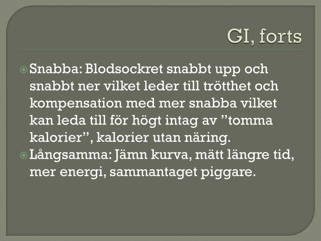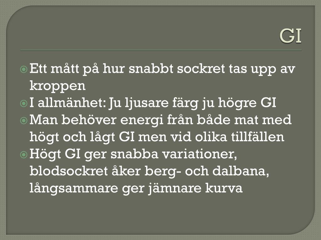 GI Ett mått på hur snabbt sockret tas upp av kroppen I allmänhet: Ju ljusare färg ju högre GI Man behöver energi från både mat med högt och lågt GI men vid olika tillfällen Högt GI ger snabba variationer, blodsockret åker berg- och dalbana, långsammare ger jämnare kurva