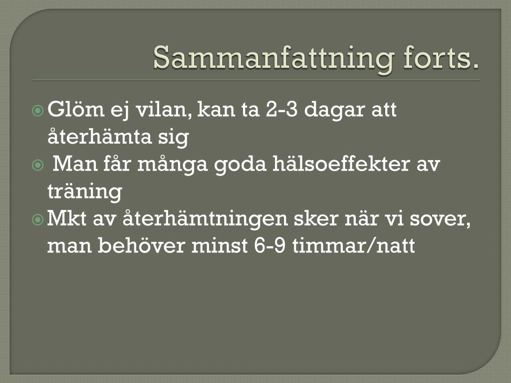 Sammanfattning forts. Glöm ej vilan, kan ta 2-3 dagar att återhämta sig Man får många goda hälsoeffekter av träning Mkt av återhämtningen sker när vi sover, man behöver minst 6-9 timmar/natt