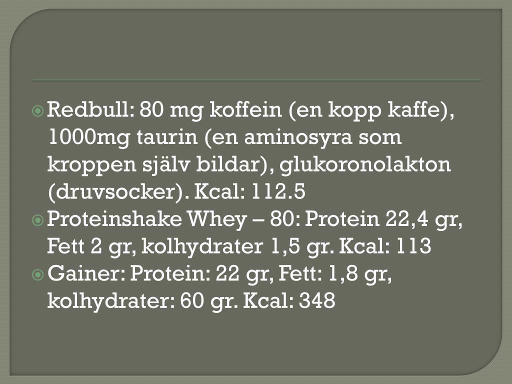 Redbull: 80 mg koffein (en kopp kaffe), 1000mg taurin (en aminosyra som kroppen själv bildar), glukoronolakton (druvsocker). Kcal: 112.5 Proteinshake Whey – 80: Protein 22,4 gr, Fett 2 gr, kolhydrater 1,5 gr. Kcal: 113 Gainer: Protein: 22 gr, Fett: 1,8 gr, kolhydrater: 60 gr. Kcal: 348