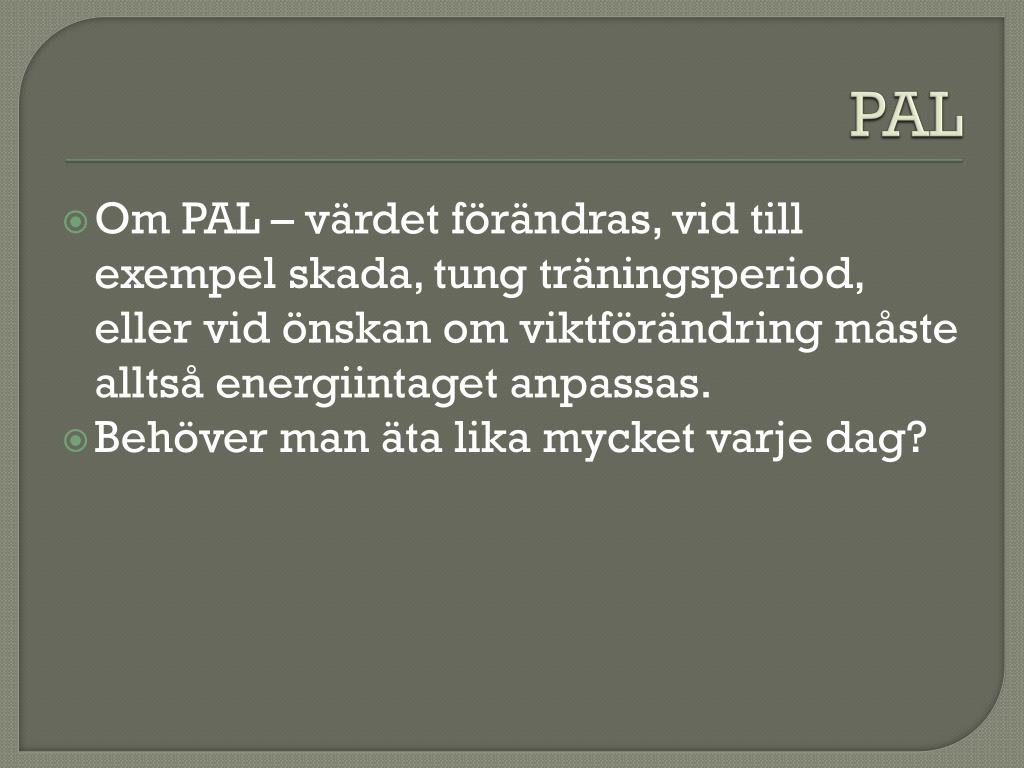 PAL Om PAL – värdet förändras, vid till exempel skada, tung träningsperiod, eller vid önskan om viktförändring måste alltså energiintaget anpassas. Behöver man äta lika mycket varje dag?