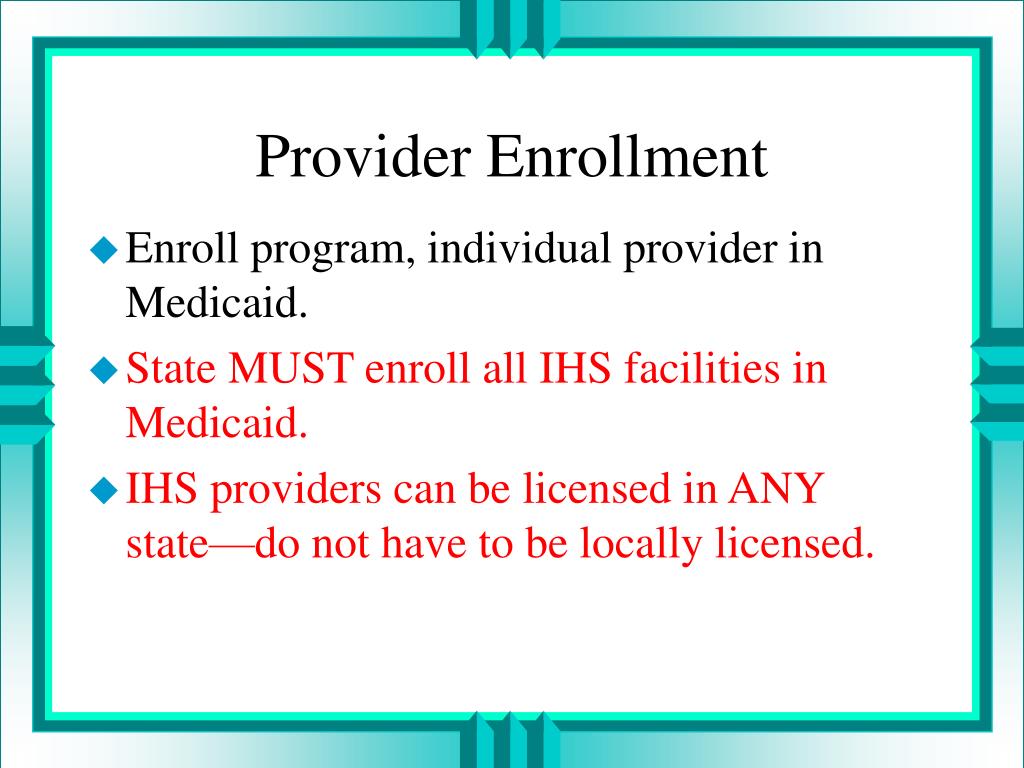 Provider Enrollment • Enroll program, individual provider in Medicaid. • State MUST enroll all IHS facilities in Medicaid. • IHS providers can be licensed in ANY state—do not have to be locally licensed.