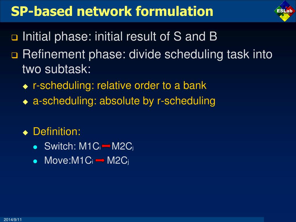 SP-based network formulation • Initial phase: initial result of S and B • Refinement phase: divide scheduling task into two subtask: • r-scheduling: relative order to a bank • a-scheduling: absolute by r-scheduling • Definition: • Switch: M1Ci M2Cj • Move:M1Ci M2Cj