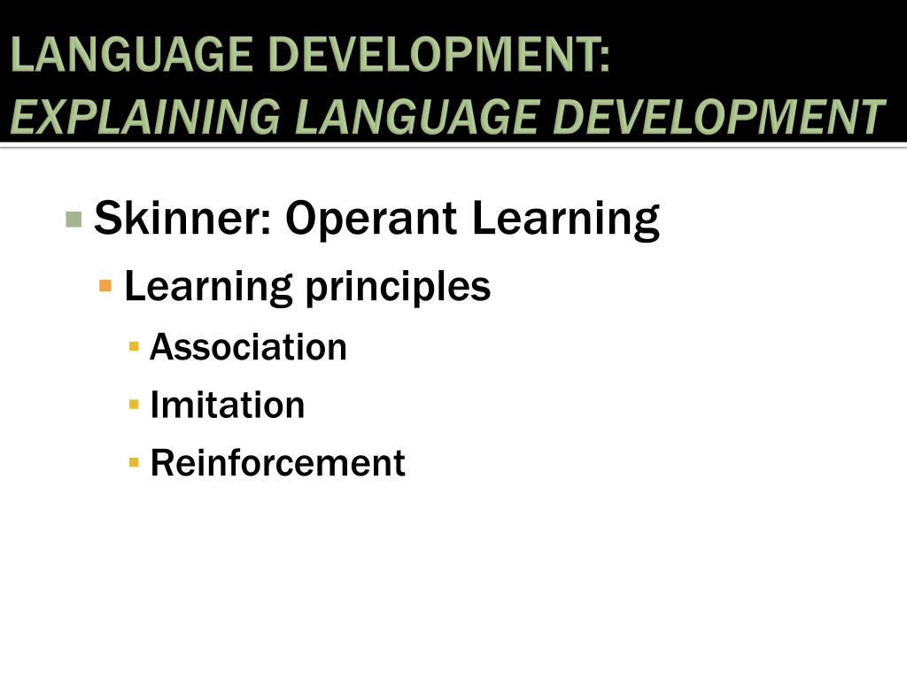LANGUAGE DEVELOPMENT: EXPLAINING LANGUAGE DEVELOPMENT • Skinner: Operant Learning • Learning principles • Association • Imitation • Reinforcement
