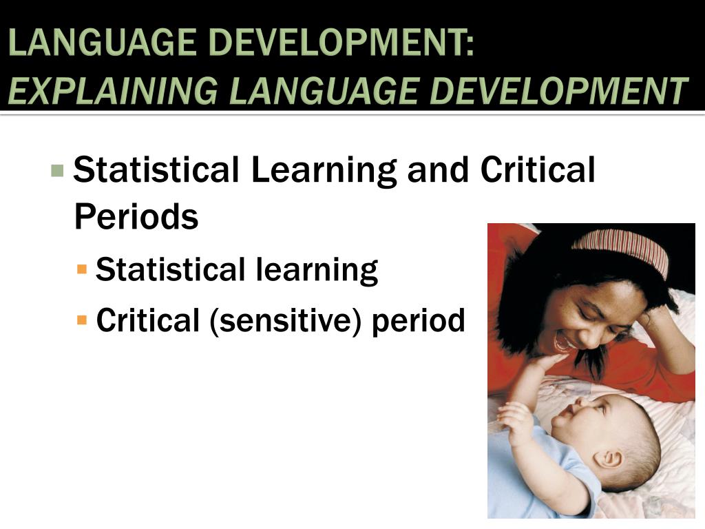 LANGUAGE DEVELOPMENT: EXPLAINING LANGUAGE DEVELOPMENT • Statistical Learning and Critical Periods • Statistical learning • Critical (sensitive) period
