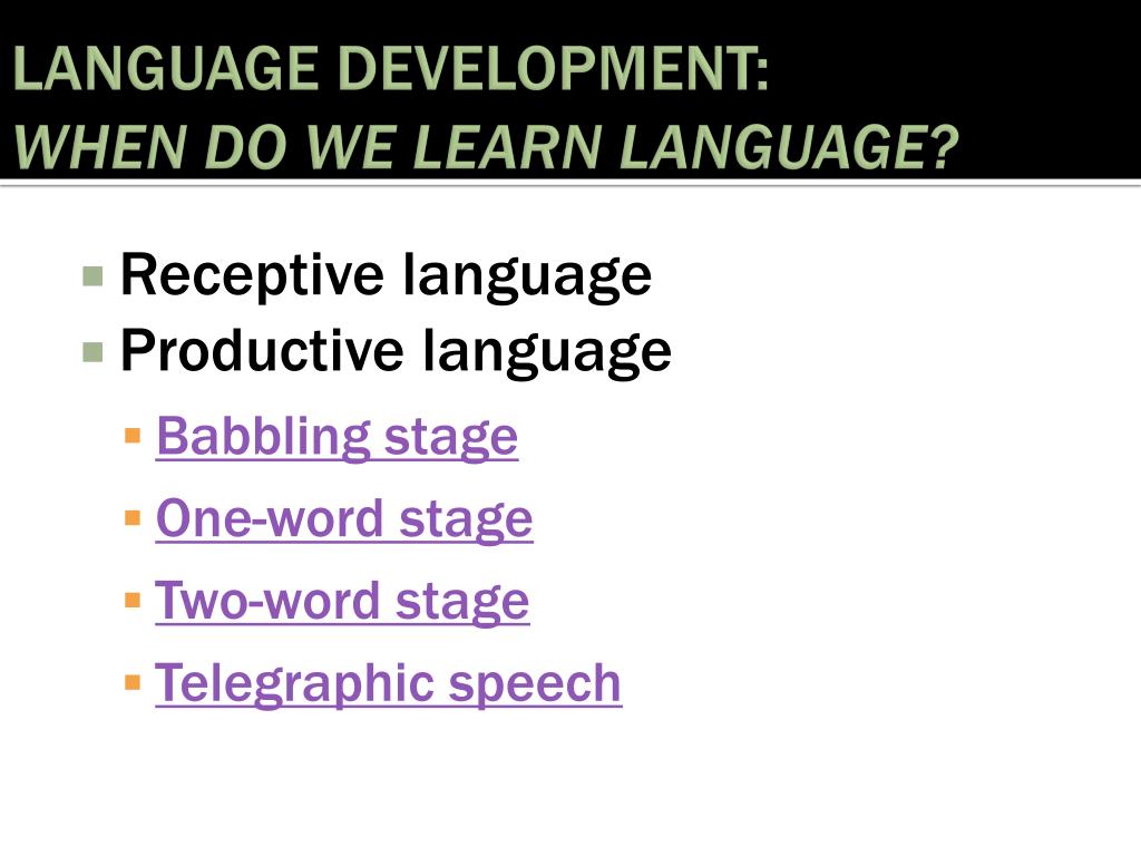 LANGUAGE DEVELOPMENT: WHEN DO WE LEARN LANGUAGE? • Receptive language • Productive language • Babbling stage • One-word stage • Two-word stage • Telegraphic speech