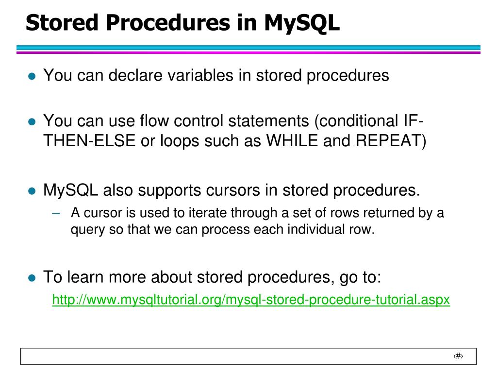 Stored Procedures in MySQL • Use show procedure status to display the list of stored procedures you have created • Use drop procedure to remove a stored procedure