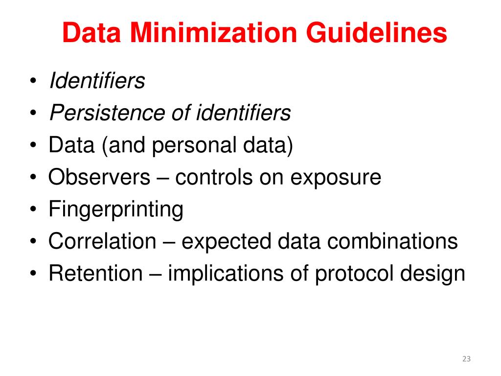 Data Minimization Guidelines • Identifiers • Persistence of identifiers • Data (and personal data) • Observers – controls on exposure • Fingerprinting • Correlation – expected data combinations • Retention – implications of protocol design