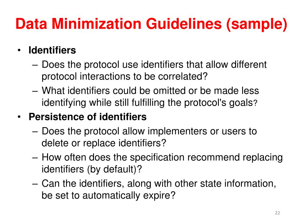 Data Minimization Guidelines (sample) • Identifiers • Does the protocol use identifiers that allow different protocol interactions to be correlated? • What identifiers could be omitted or be made less identifying while still fulfilling the protocol's goals? • Persistence of identifiers • Does the protocol allow implementers or users to delete or replace identifiers? • How often does the specification recommend replacing identifiers (by default)? • Can the identifiers, along with other state information, be set to automatically expire?