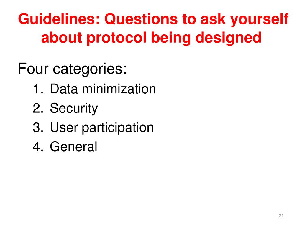 Guidelines: Questions to ask yourself about protocol being designed Four categories: • Data minimization • Security • User participation • General