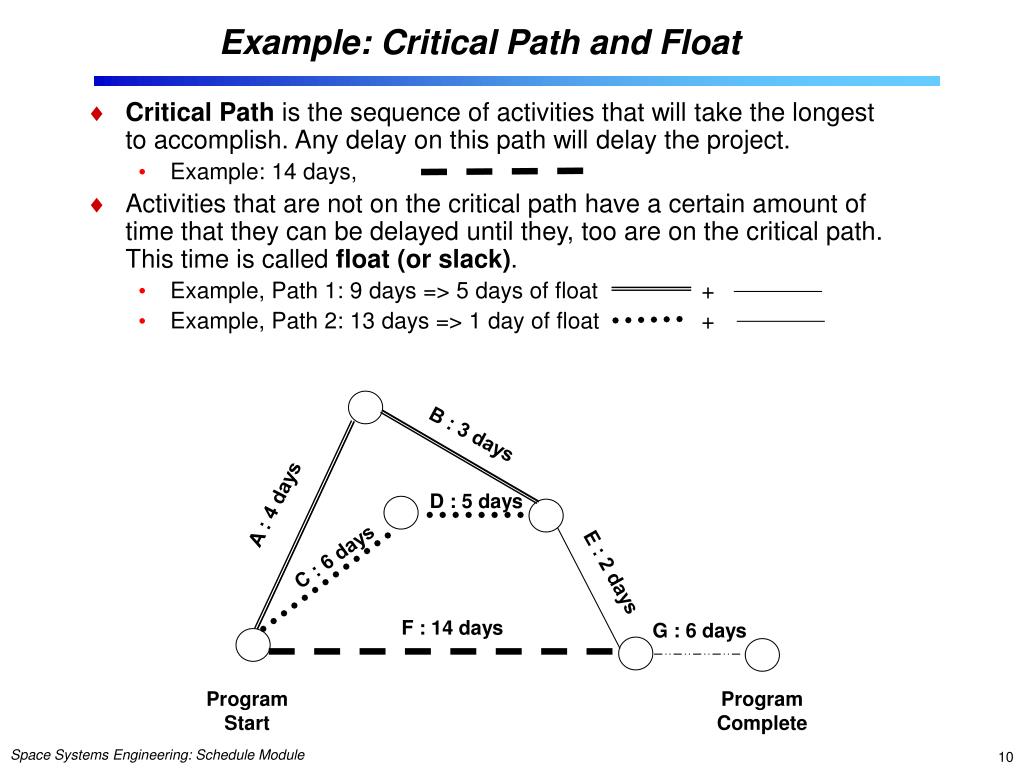 Module Purpose: Schedule • To understand the different types of schedules: Gantt chart, milestone chart, network schedules. To recognize their advantages and disadvantages. • To introduce the key concepts of critical path and float as applied to network scheduling. • To show how to prepare a schedule and estimate activity durations. • To introduce schedule margin recommendations. • To discuss example schedule performance measures and reporting formats.