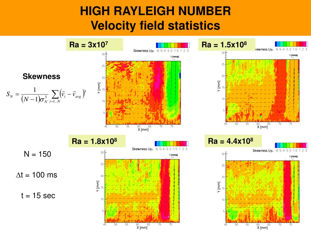 HIGH RAYLEIGH NUMBERVelocity field statistics Ra = 3x107 Ra = 1.5x108 Skewness Ra = 4.4x108 Ra = 1.8x108 N = 150 t = 100 ms t = 15 sec