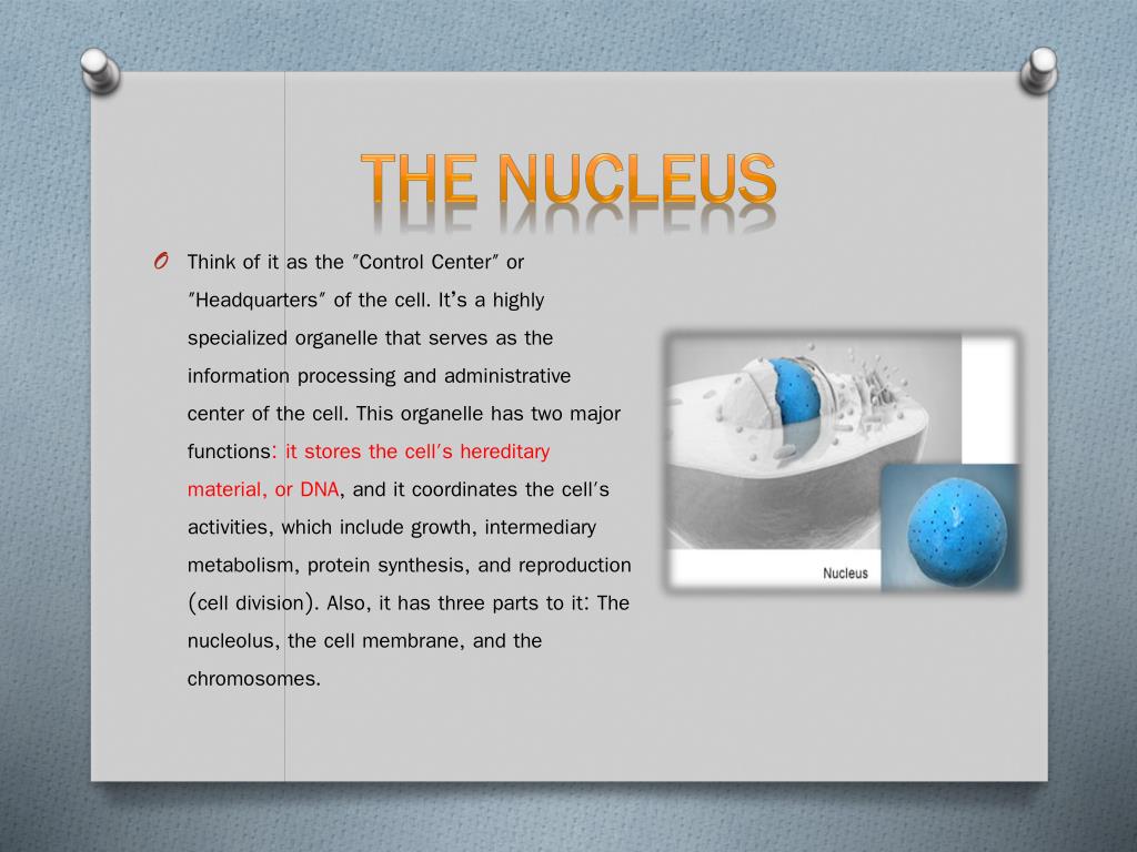 The Nucleus • Think of it as the "Control Center" or "Headquarters" of the cell. It’s a highly specialized organelle that serves as the information processing and administrative center of the cell. This organelle has two major functions: it stores the cell's hereditary material, or DNA, and it coordinates the cell's activities, which include growth, intermediary metabolism, protein synthesis, and reproduction (cell division). Also, it has three parts to it: The nucleolus, the cell membrane, and the chromosomes.
