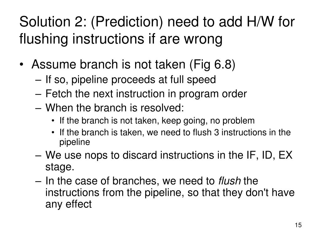 Solution 2: (Prediction) need to add H/W for flushing instructions if are wrong • Assume branch is not taken (Fig 6.8) • If so, pipeline proceeds at full speed • Fetch the next instruction in program order • When the branch is resolved: • If the branch is not taken, keep going, no problem • If the branch is taken, we need to flush 3 instructions in the pipeline • We use nops to discard instructions in the IF, ID, EX stage. • In the case of branches, we need to flush the instructions from the pipeline, so that they don't have any effect