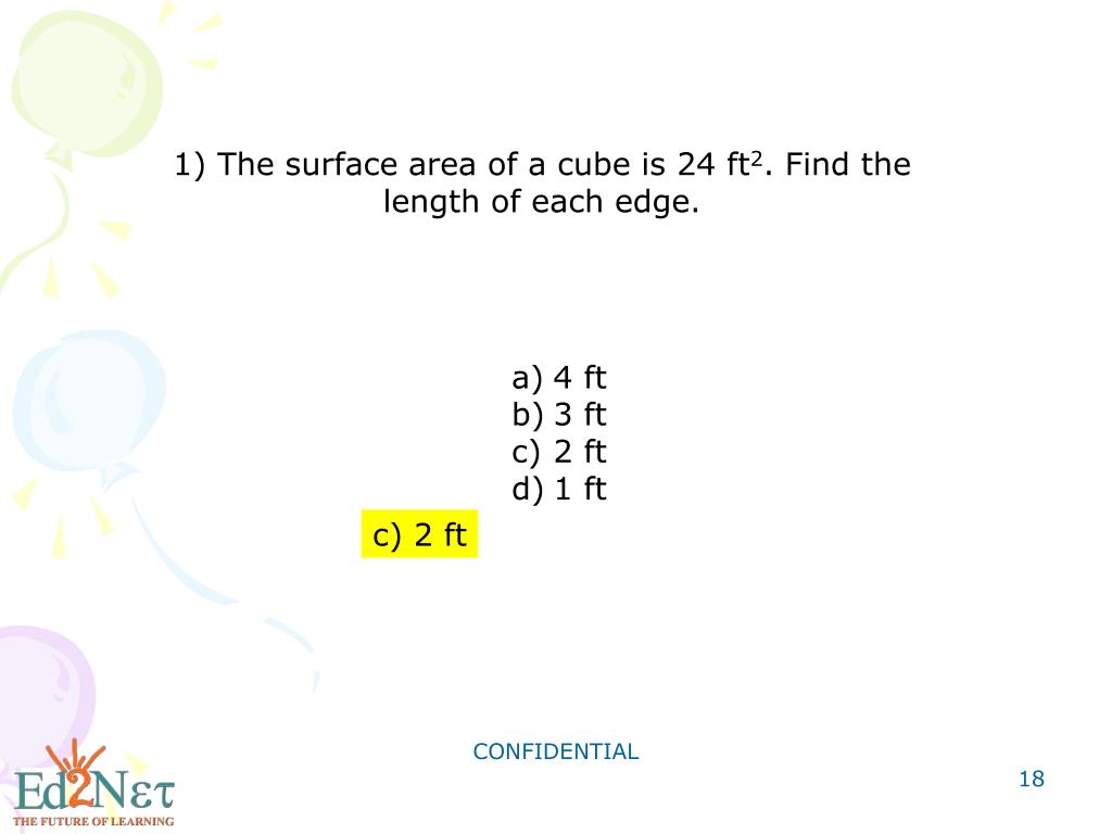 1) The surface area of a cube is 24 ft2. Find the length of each edge. • 4 ft • 3 ft • 2 ft • 1 ft c) 2 ft CONFIDENTIAL 18