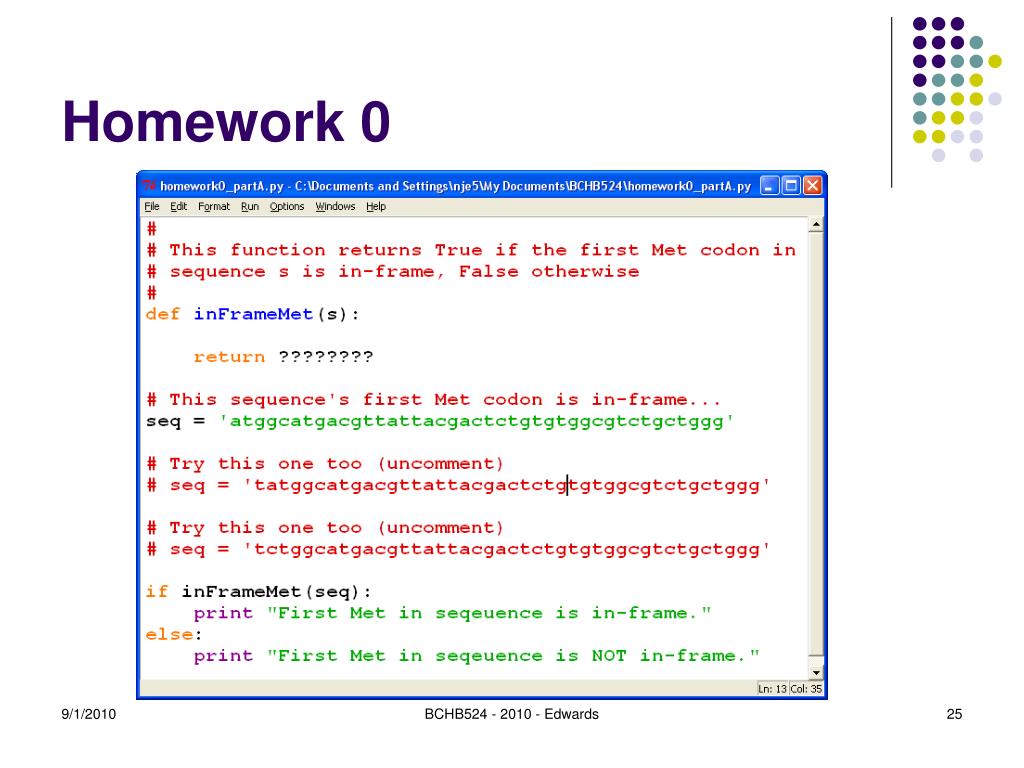 Homework 0 • Due tomorrow, Sep 2nd, 12 noon • Complete two python programs using only the material in this lecture • Program shells provided • Make sure you test with multiple "inputs" • Run using IDLE (F5) BCHB524 - 2010 - Edwards