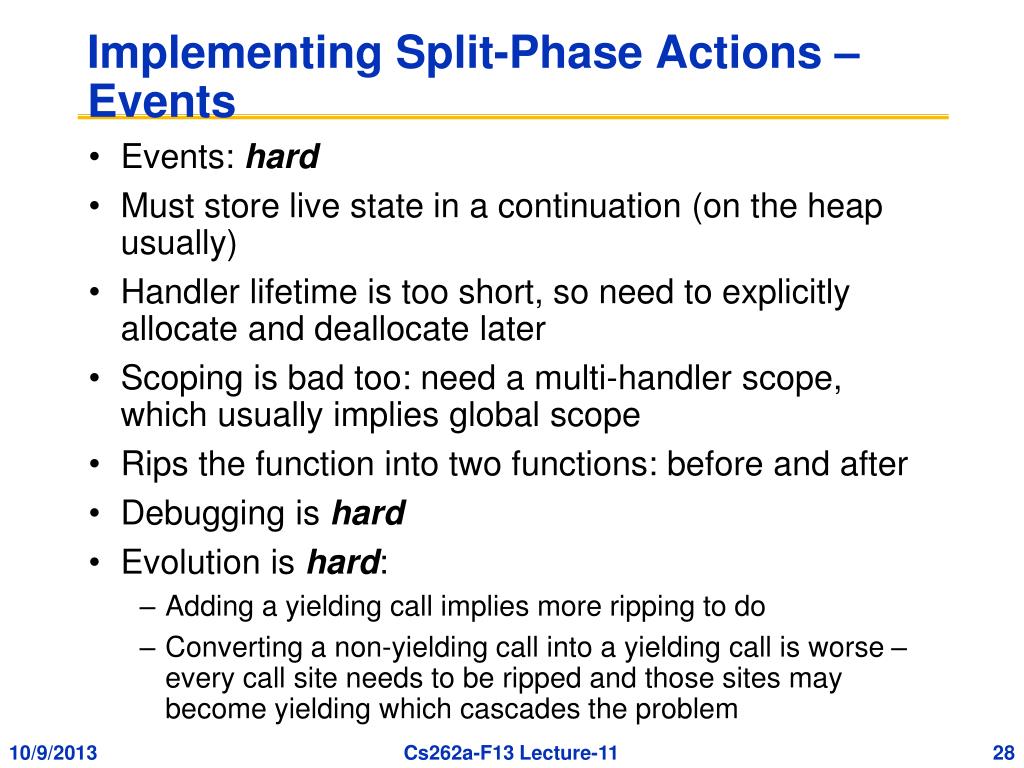 Implementing Split-Phase Actions – Events • Events: hard • Must store live state in a continuation (on the heap usually) • Handler lifetime is too short, so need to explicitly allocate and deallocate later • Scoping is bad too: need a multi-handler scope, which usually implies global scope • Rips the function into two functions: before and after • Debugging is hard • Evolution is hard: • Adding a yielding call implies more ripping to do • Converting a non-yielding call into a yielding call is worse – every call site needs to be ripped and those sites may become yielding which cascades the problem