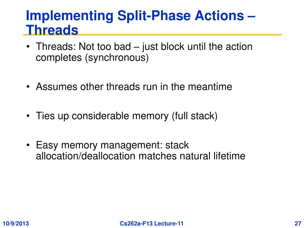 Implementing Split-Phase Actions – Threads • Threads: Not too bad – just block until the action completes (synchronous) • Assumes other threads run in the meantime • Ties up considerable memory (full stack) • Easy memory management: stack allocation/deallocation matches natural lifetime