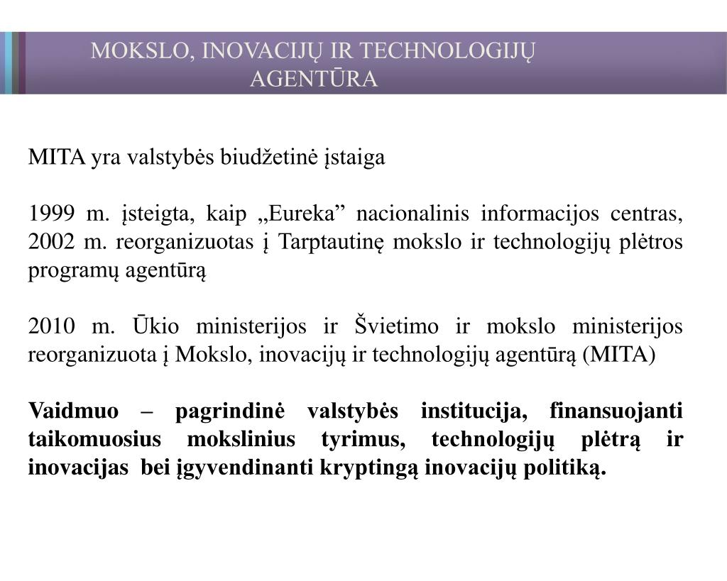 MOKSLO, INOVACIJŲ IR TECHNOLOGIJŲ AGENTŪRA • MITA yra valstybės biudžetinė įstaiga • 1999 m. įsteigta, kaip „Eureka” nacionalinis informacijos centras, 2002 m. reorganizuotas į Tarptautinę mokslo ir technologijų plėtros programų agentūrą • 2010 m. Ūkio ministerijos ir Švietimo ir mokslo ministerijos reorganizuota į Mokslo, inovacijų ir technologijų agentūrą (MITA) • Vaidmuo – pagrindinė valstybės institucija, finansuojanti taikomuosius mokslinius tyrimus, technologijų plėtrą ir inovacijas bei įgyvendinanti kryptingą inovacijų politiką.